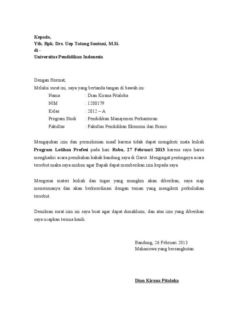 Mengajukan permohonan surat izin melanjutkan pendidikan ke jenjang yang lebih tinggi (s1) pada ; Contoh surat izin tidak masuk kuliah karena tugas kantor. Karena ada beberapa perusahaan atau sekolah yang memang menerapkan izin resmi untuk setiap anggotanya. Demikian surat permohonan izin ini saya perbuat dengan sebenarnya, atas perhatian dan kebijaksanaan dari bapak/ibu dosen, saya ucapkan terimakasih. Penulisan surat dengan cara ini juga mempermudah kamu sehingga tidak.